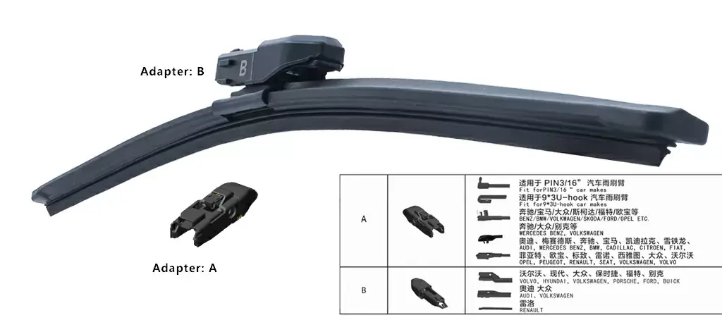 01:Wiper design Integrated design of guide wing and rubber strip. 02:texture of material The memory steel sheet imported from Belgium, which is the same as the original factory of Dr. Valeo, adopts POM material for the top cover to firmly fix the wiper shrapnel, and the brush head connector adopts high-strength alloy plastic, which is safe, stable, wear-resistant and durable. 03:Wiper adapter There are 13 brush heads in total, which are 95% similar to the height and shape of the original wiper, meet 99% of the special models, and reduce the special inventory of special vehicles. 04:surface coating Coated with anti UV powder, efficiently improved weatherability of wipers. 05:Wiper strip The independently developed wiper strip has high and low temperature resistance: – 40 ~ 80 ℃, ozone resistance: 50pphm * 40 ℃ * 20% elongation * 72h.The surface of Teflon is fluorinated and silent. After layer by layer test and verification, it has superior performance and durability. |